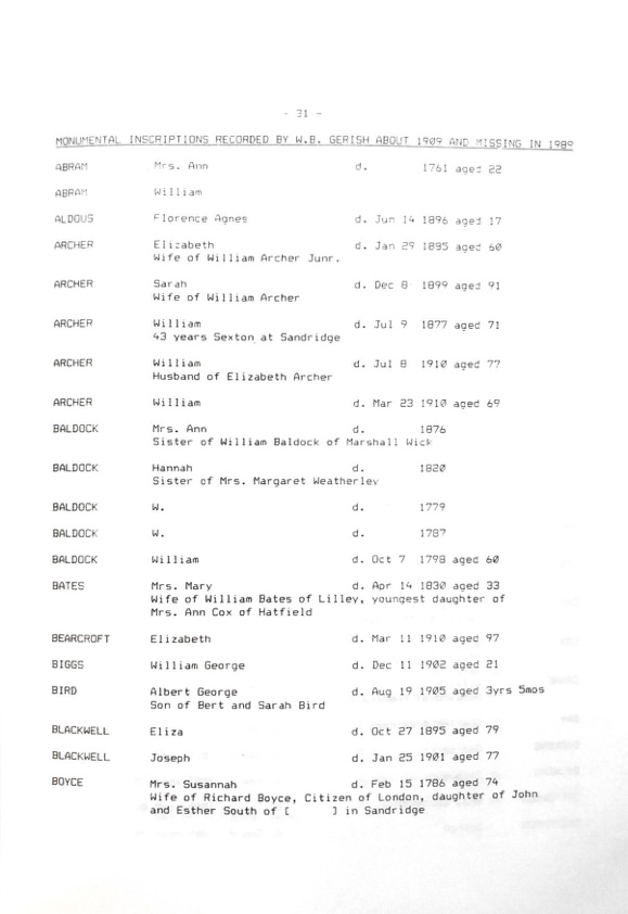 Linked to | SAINT LEONARDS CHURCH, SANDRIDGE, HERTFORDSHIRE, ENGLAND; Monumental inscriptions - the parish church of St Leonard 1990 |