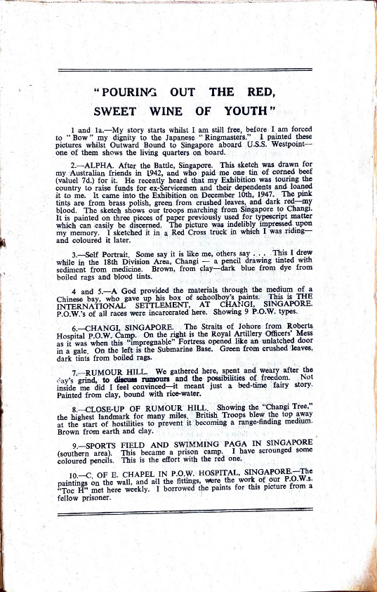 2.—ALPHA. After the Battle, Singapore. This sketch was drawn for my Australian friends in 1942, and who paid me one tin of corned beef (value 7d.) for it. He recently heard that my Exhibition was touring the country to raise funds for ex-Servicemen and their dependents and loaned it to me. It came into the Exhibition on December 10th, 1947. The pink tints are from brass polish, green from crushed leaves, and dark - my red blood. The sketch shows our troops marching from Singapore to Changi. It is painted on three pieces of paper previously used for typescript matter which can easily be discerned. The picture was indelibly impressed upon my memory. I sketched it in a Red Cross truck in which I was riding - and coloured it later.