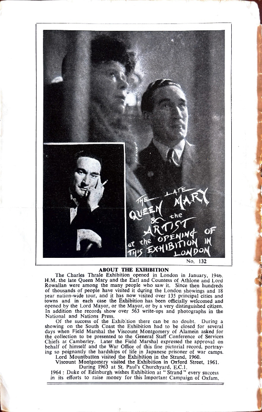 Of the success of the Exhibition there can be no doubt. During a showing on the South Coast the Exhibition had to be closed for several days when Field Marshal the Viscount Montgomery of Alamein asked for the collection to be presented to the General Staff Conference of Services Chiefs at Camberley. Later the Field Marshal expressed the approval on behalf of himself and the War Office of this fine pictorial record, portraying so poignantly the hardships of life in Japanese prisoner of war camps.