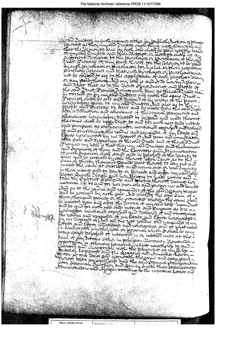 said trustees in such manner other by public auction or private contract as they my said trustees shall think most advisable and that the money to arise by such sale shall be paid unto the hands of my said trustees and their receipt or receipts shall be a sufficient discharge to the purchasor or purchasors of the said trust premises or any part therof for the money to be paid by such purchasor or purchasors for his her or their respective purchase monies and that such purchasor or purchasors shall not be obliged to see the application of such purchase money or any part thereof And my will is and I do hereby declare and direct that as to the Rents issues Interest and profits the said trust premises during such time as the said trade shall be carried on by my said trustees and until the same trust premises shall be sold and disposed of by virtue of the power hereinbefore given to my said trustees And also as to the profits and surplus to arise and be made from the said trade after addition and allowance of the several payments and allowances hereinbefore diverted to be paid and made thereout the same shall be upon trust to and for such uses and intents and purposes as are hereinafter mentioned expressed and declared of and recurring the residue and remainder of my estate and effects hereinafter by me disposed of And from and immediately after sale and disposition of the said trade and of the said trust premises my will is that my said trustees and the survivors and survivor of themand the executors and administrators of such survivor shall stand and be possessed of the money to arise and be received by sale thereof upon trust as to the sum of thirty thousand pounds part thereof to lay out and invest the same at interest on Government or real securities in their names and to pay to or permit and suffer my said wife Hester Lynch Thrale and her assigns to have receive and take the interest dividends and profits thereof during her natural life to and for her own sole and proper use and benefit And as to the residue and remainder of the said money to arise and be received by such sale And also as to the said sum of thirty thousand pounds or the securities wherein the same shall be invested from and after the decease of my said wife upon trust and to and for such ends intents and purposes as are hereinafter mentioned expressed and declared of and concerning the residue and remainder of my estate and effects hereinafter by me disposed of this and all the rest residue and remainder of my estate and effects whatsoever and wheresoever and of what nature or kind so ever whether real or personal which I shall be any ways seized possessed of interested in or entered unto at the time of my decease either in possession reversion remainder appurtenancy or otherwise howsoever subject nevertheless to and charged and chargeable with the payment of my debts given. I give devise and bequeath the same and every part thereof unto my said wife and the said Samuel Johnson John Cator Jeremiah Crutchley and Henry Smith their heirs executors administrators and assigns according to the respective estate and