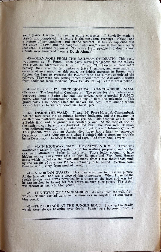 40.—SURVIVORS FROM THE RAILWAY OF DEATH. This party was known as "F" Force. Each party leaving Singapore for the railway was given an identification letter. "F" and "H" Forces suffered more heavily—they were the last parties to leave Singapore, and were made up entirely of sick men. At this stage, the British successes in Burma were forcing the Japs to evacuate the P.O.W.s who had almost completed the railway. They were now getting forced labour from the Malayans. (Brown from sediment from medicine. (Pink (what's left of it) from brass polish):