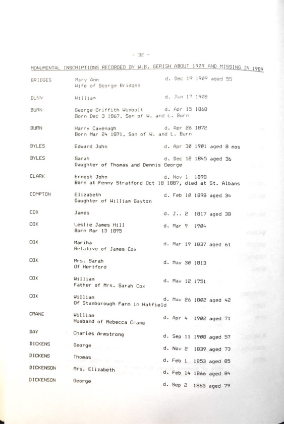 Linked to | SAINT LEONARDS CHURCH, SANDRIDGE, HERTFORDSHIRE, ENGLAND; Monumental inscriptions - the parish church of St Leonard 1990 |