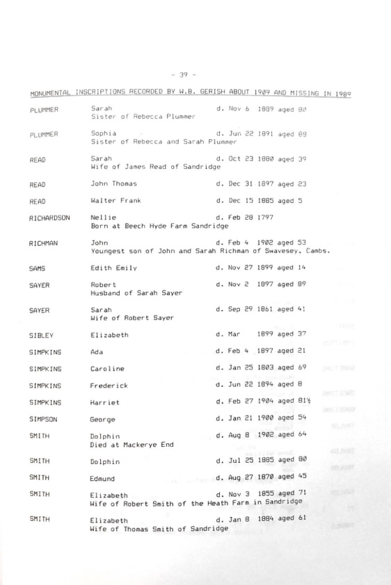 Linked to | SAINT LEONARDS CHURCH, SANDRIDGE, HERTFORDSHIRE, ENGLAND; Monumental inscriptions - the parish church of St Leonard 1990 |