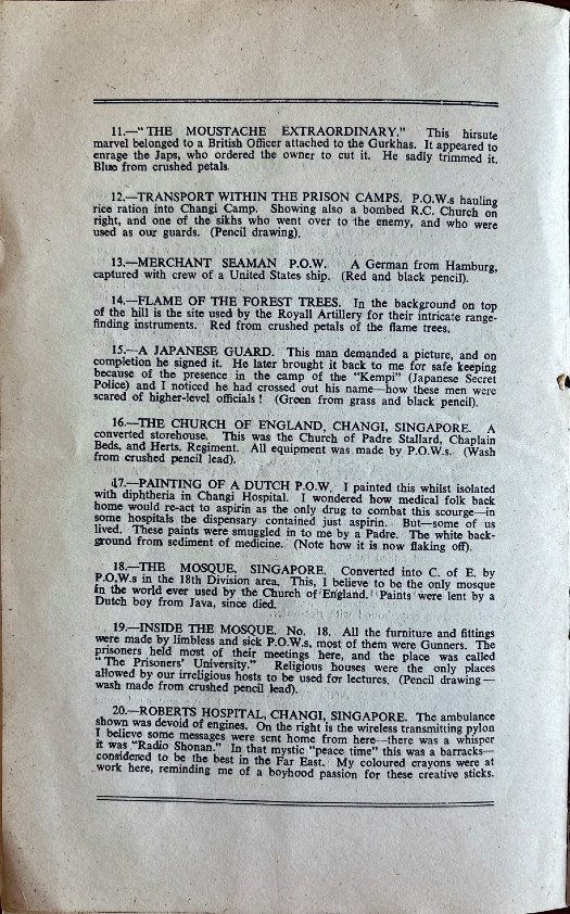 18.—THE MOSQUE, SINGAPORE. Converted into C. of E, by P.O.W.s in the 18th Division area. This, I believe to be the only mosque in the world ever used by the Church of England. Paints were lent by a Dutch boy from Java, since died.