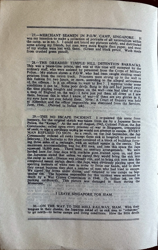 29.—THE NO ESCAPE INCIDENT. I re-painted this scene from memory, for the original sketch was taken from me by a Japanese Secret Police, the "Kempi". At the end of August, 1942, Colonel Fukue, the Jap Commander: called upon every prisoner offwar in Singapore, irrespective of rank, to sign a certificate saying he would not attempt to escape. EVERY MAN REFUSED TO SIGN. As a result, on the 2nd. September, the Jap Commander ordered all ranks (except those sick in hospital) to proceed to Selerang. The barracks at this place consisted of a block of buildings forming three sides of a rectangle, with an asphalt square in the centre. The maximum accommodation was for 8S0 men. and into this space the Japs squeezed 16,000 men. There were no sanitary arrangements. herded here for four days with machine guns trained upon us, and then the Japanese stated that unless we signed they would bring the sick into the camp as well. Discase was already rife, and to bring sick men into this compound meant certain death—the japs were obviously playing upon the sporting instincts of white men in order to force our hands, and to show they meant business they, shot a number of men, who had tried to escape. We signed, the forms under duress, and returned to our camps on September 6th. The Japanese responsible for this incident were sentenced to death by a War. Crimes Commission in 1946O. (Indian ink, on thin packing cardboard). This picture was damaged in Siam during the Monsoons.