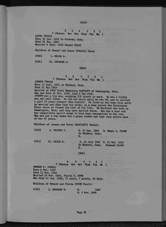 | Download PDF | Thrall Genealogy 1630-1965, Compiled by Durward Stephen Thrall. Prepared for publication by Grant Leslie Thrall 1976. |