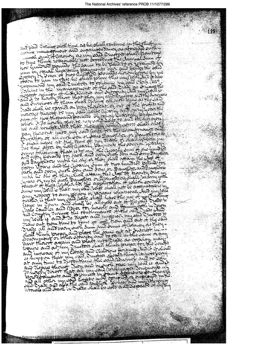 and paid during such time as he shall continue in the chief acting management and superintendent as aforesaid annual sum of money as my said trustees shall from time to time think reasonable not exceeding the annual sum of two hundred pounds the same to be paid to or retained by him by equal quarterly payments over and besides the said legacy or sum of two hundred pounds hereinbefore by me given to him in case he shall prove this my will which I also recommend my said trustees to continue my said clerk Mr Perkins in the management of the trade as I have the highest opinion of his abilities and integrity and my Will is and I do hereby direct that they my said trustees and the survivors and survivor of them shall during all such time as the said trade shall be carried on pay thereout or out of the profits and income thereof to my said wife yearly and every year the sum of two thousand pounds by equal quarterly payments which I do here by give to my said wife to and for her own use and benefit And that they my said trustees shall also pay thereout unto my said wife for the maintenance and duration of all such son and sons Daughter and Daughters as I shall have at the time of my death or shall be born in the time after by half yearly payments the several yearly sums following that is to say the yearly sum of one hundred and fifty pounds for each and every such son and sons daughter and daughters until he she or they shall attain the age of fifteen years and the yearly sum of two hundred pounds for each and every such son and sons daughter and daughters until he she or they shall attain the age of twenty one years or until such daughter or daughters shall marry with consent of their Mother for the application of which several sums my will is that my said wife shall not be accountable in any respect to any person or persons whatsoever And my will further is that may said wife shall have the use of my dwelling house in town and shall be allowed out of the said trade coals candles and beer for herself and family both in town and country during the continuance of the said trade And my will is and I do direct and empower my said trustees to draw out from time to time in or from and out of the said trade all and every such sum and sums of money as they shall think proper and place the same out at interest in government or other security and to call in the same or any part therof again and place into trade as occasion may require and as my trustees shall think proper for the benefit and increase if my estate and childrens fortunes And if it should so happen that my said trustees should think it necessary at any time to discontinue the said business and to sell and dispose thereof Then and in such case my will is and I solemnly direct that all my said mortgages tenements hereditaments and premises in Saint Saviours Southwark and all other my said estate used occupied or employed in the said trade and also the said public houses and my brewing utensils and stock in trade shall be sold and disposed of by my
