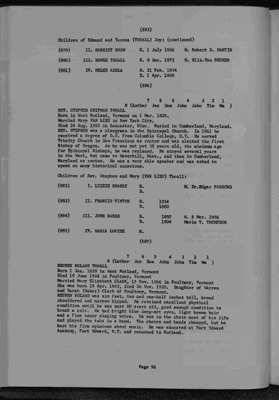| Download PDF | Thrall Genealogy 1630-1965, Compiled by Durward Stephen Thrall. Prepared for publication by Grant Leslie Thrall 1976. |