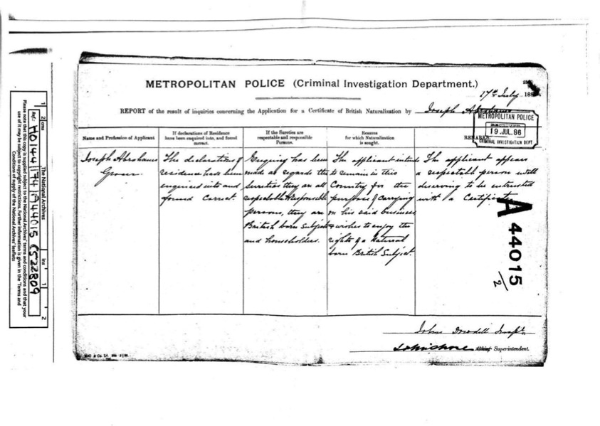 Joseph Alexander FRANCK, application for naturalisation