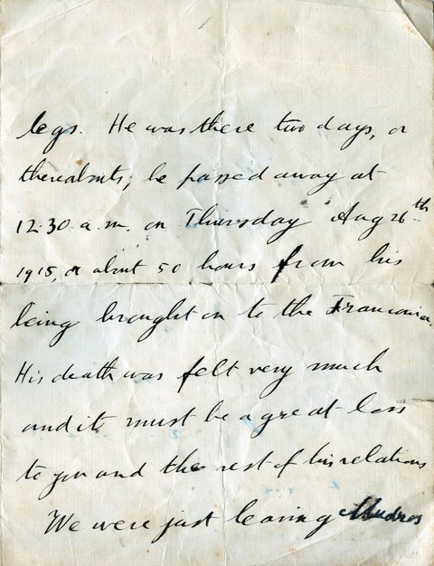 legs. He was there two days, or thereabouts; he passed away at 12:30 am on Thursday 26th 1915, or about 50 hours from his being brought into the Franconian. His death was felt very much and it must be a great loss to you and the rest of his relations.