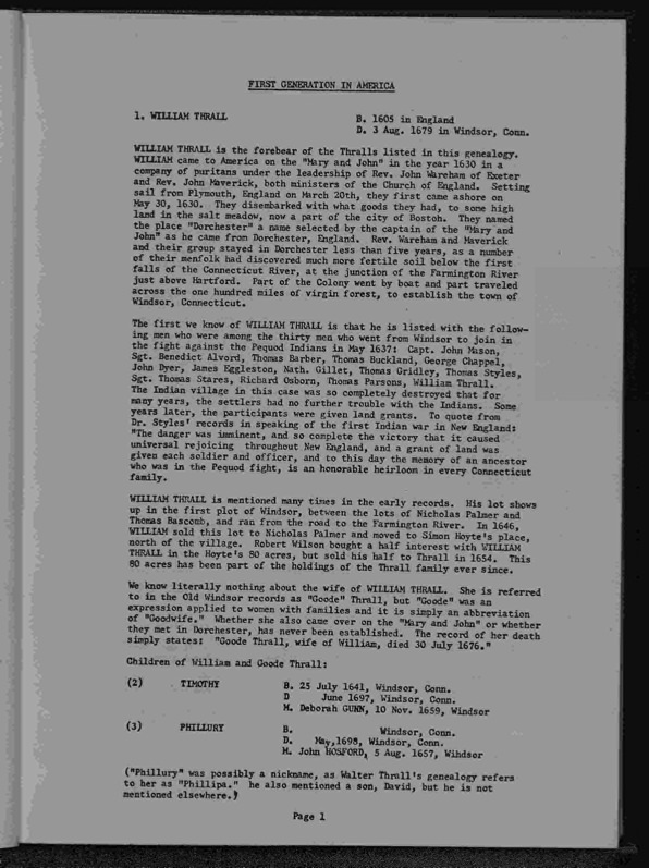 | Download PDF | Thrall Genealogy 1630-1965, Compiled by Durward Stephen Thrall. Prepared for publication by Grant Leslie Thrall 1976. |